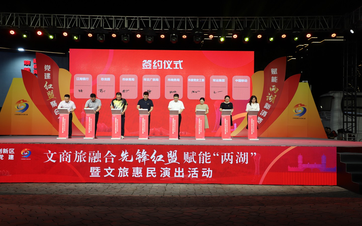 9月13日晚,“黨建紅盟聚合力、賦能兩湖新消費(fèi)”文商旅融合先鋒紅盟賦能“兩湖”暨文旅惠民演出活動在藍(lán)海豚文化藝術(shù)街區(qū)成功舉行。市級機(jī)關(guān)工委書記趙天晟,副書記潘奕,市文廣旅局黨組書記、局長嚴(yán)俊,市商務(wù)局黨組書記、局長韓雪琴,市黨史工委主任柯善學(xué)等領(lǐng)導(dǎo)出席活動;金壇、武進(jìn)、鐘樓區(qū)文旅(體育)、商務(wù)、黨史部門領(lǐng)導(dǎo)及恐龍園、江南銀行、常州移動等紅盟單位重點企業(yè)領(lǐng)導(dǎo)參加活動。集團(tuán)公司黨委書記、總經(jīng)理朱平春、副總經(jīng)理黃細(xì)富等領(lǐng)導(dǎo)及街區(qū)商管公司相關(guān)人員參加活動。